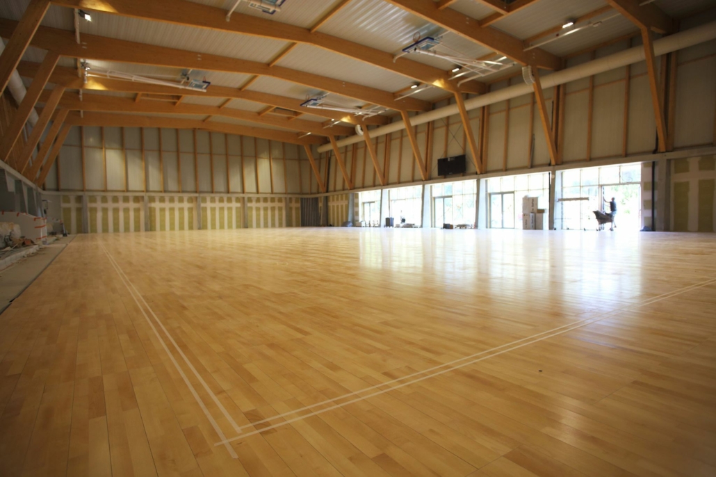 - Sol PVC sportif et parquet démontable (junckers) avec équipements pour basket (paniers), handball (buts,…),